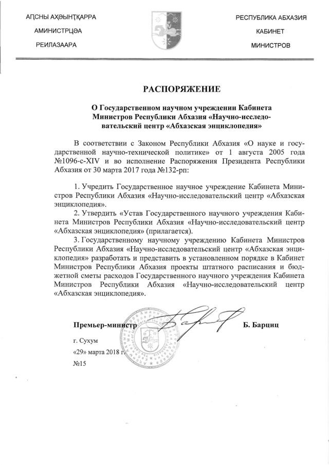 Распоряжение Кабинета Министров Республики Абхазия от 29.03.2018 № 15 "О Государственном научном учреждении Кабинета Министров Республики Абхазия "Научно-исследовательский центр "Абхазская энциклопедия"