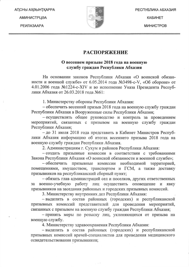 Распоряжение Кабинета Министров Республики Абхазия от 06.04.2018 № 21 "О весеннем призыве 2018 года на военную службу граждан Республики Абхазия"