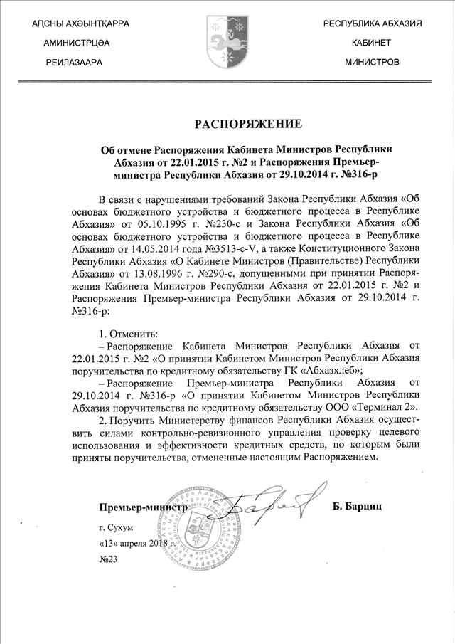 Распоряжение Кабинета Министров Республики Абхазия от 13.04.2018 № 23 "Об отмене Распоряжения Кабинета Министров Республики Абхазия от 22.01.2015 г. № 2 и Распоряжения Премьер-министра Республики Абхазия от 29.10.2014 г. № 316-р"