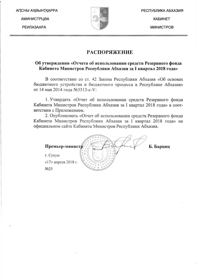 Распоряжение Кабинета Министров Республики Абхазия от 17.04.2018 № 25 "Об утверждении "Отчета об использовании средств Резервного фонда Кабинета Министров Республики Абхазия за I квартал 2018 года"