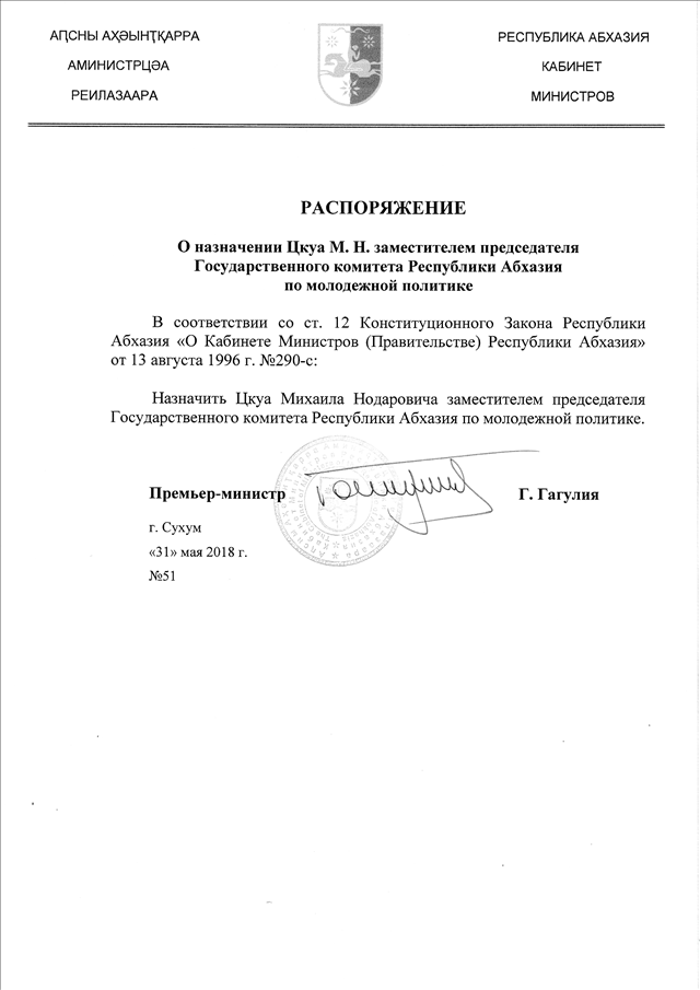 Распоряжение Кабинета Министров Республики Абхазия от 31.05.2018 № 51 "О назначении Цкуа М.Н. заместителем председателя Государственного комитета Республики Абхазия по молодежной политике"