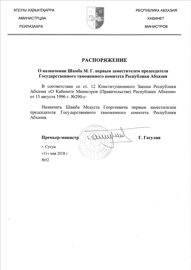 Распоряжение Кабинета Министров Республики Абхазия от 31.05.2018 № 52 "О назначении Шамба М.Г. первым заместителем председателя Государственного таможенного комитета Республики Абхазия"