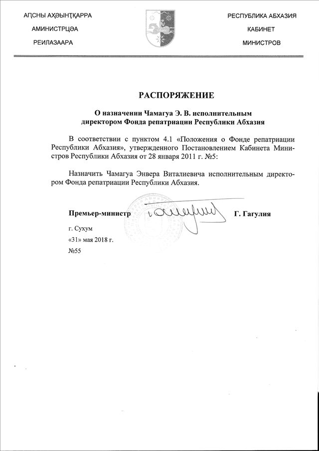 Распоряжение Кабинета Министров Республики Абхазия от 31.05.2018 № 55 "О назначении Чамагуа Э.В. исполнительным директором Фонда репатриации Республики Абхазия"