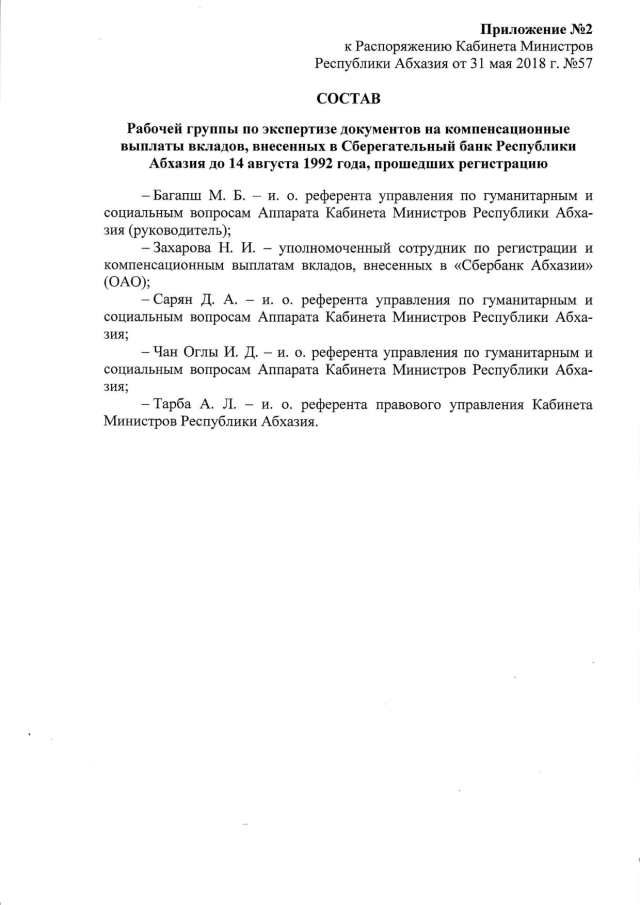 Распоряжение Кабинета Министров Республики Абхазия от 31.05.2018 № 57 "О составе Комиссии при Кабинете Министров Республики Абхазия по регистрации и компенсационным выплатам вкладов, внесенных в Сберегательный банк Республики Абхазия до 14 августа 1992 года"