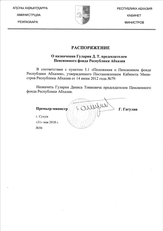 Распоряжение Кабинета Министров Республики Абхазия от 31.05.2018 № 56 "О назначении Гулария Д.Т. председателем Пенсионного фонда Республики Абхазия"