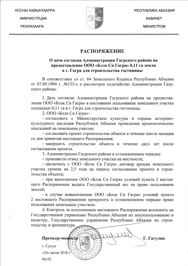 Распоряжение Кабинета Министров Республики Абхазия от 26.07.2018 № 102 "О даче согласия Администрации Гагрского района на предоставление ООО "Блэк Си Гагра" 0,11 га земли в г. Гагра для строительства гостиницы"
