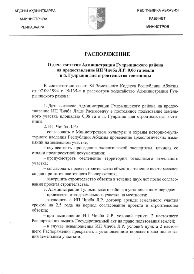 Распоряжение Кабинета Министров Республики Абхазия от 26.07.2018 № 103 "О даче согласия Администрации Гулрыпшского района на предоставление ИП Чичба Л.Р. 0,06 га земли в п. Гулрыпш для строительства гостиницы"