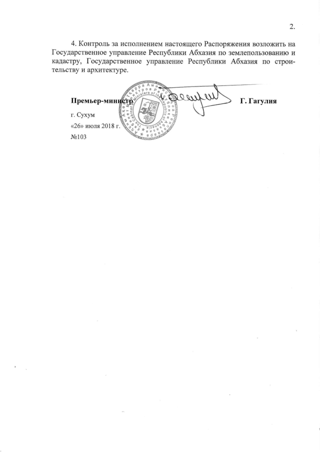Распоряжение Кабинета Министров Республики Абхазия от 26.07.2018 № 103 "О даче согласия Администрации Гулрыпшского района на предоставление ИП Чичба Л.Р. 0,06 га земли в п. Гулрыпш для строительства гостиницы"