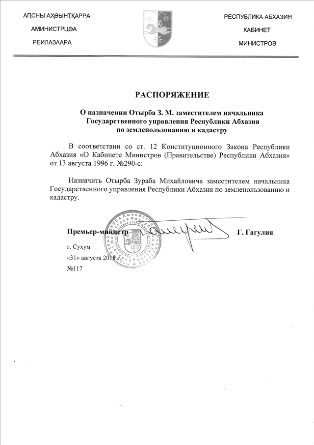 Распоряжение Кабинета Министров Республики Абхазия от 31.08.2018 № 117 "О назначении Отырба 3.М. заместителем начальника Государственного управления Республики Абхазия по землепользованию и кадастру"
