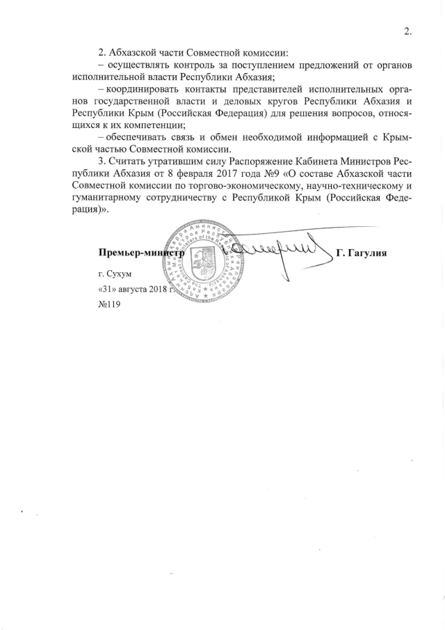 Распоряжение Кабинета Министров Республики Абхазия от 31.08.2018 № 119 "О составе Абхазской части Совместной комиссии по торгово-экономическому, научно-техническому и гуманитарному сотрудничеству с Республикой Крым (Российская Федерация)"