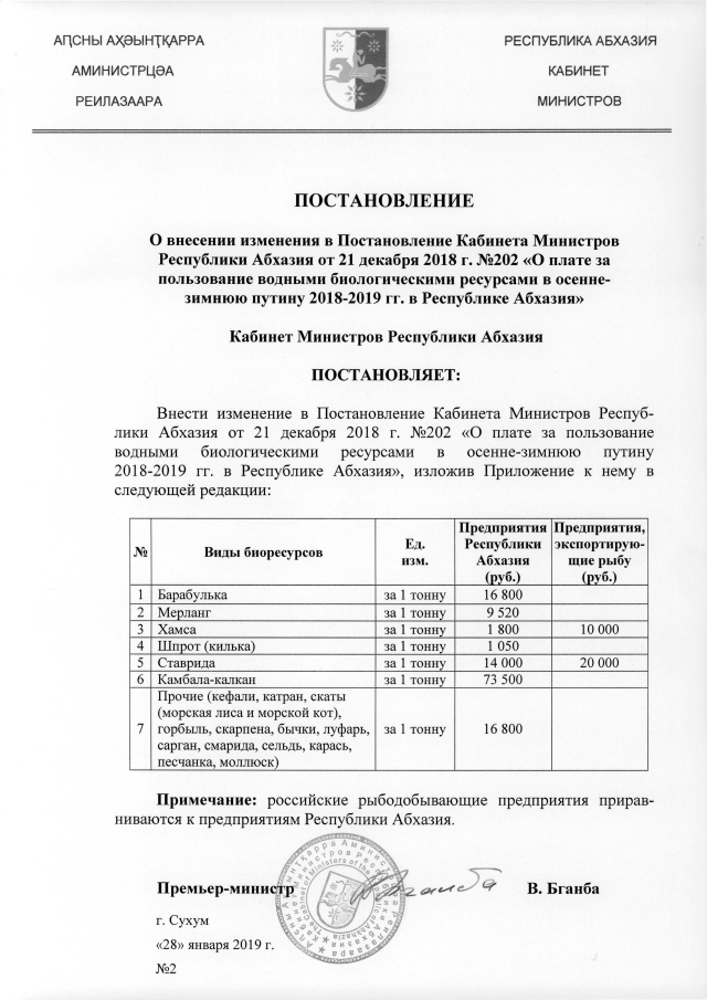 Постановление Кабинета Министров Республики Абхазия от 28.01.2019 № 2 "О внесении изменения в Постановление Кабинета Министров Республики Абхазия от 21 декабря 2018 г. №202 <О плате за пользование водными биологическими ресурсами в осенне-зимнюю путину 2018-2019 гг. в Республике Абхазия>"