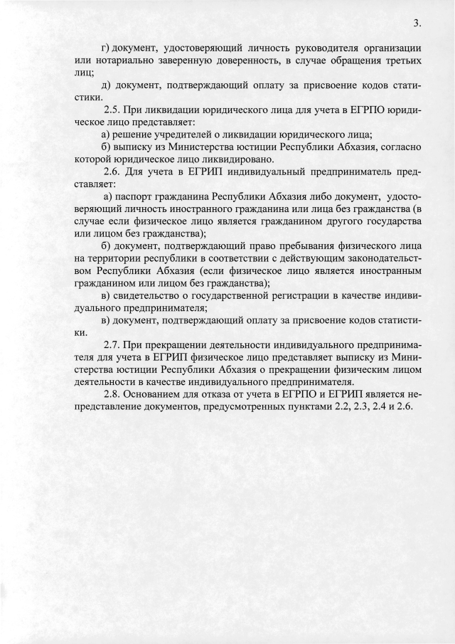 Постановление Кабинета Министров Республики Абхазия от 11.01.2019 № 1 "Об утверждении Порядка ведения Единого государственного регистра предприятий и организаций (ЕГРПО), Единого государственного регистра индивидуальных предпринимателей (ЕГРИП) и Тарифов за присвоение статистических идентификационных кодов"