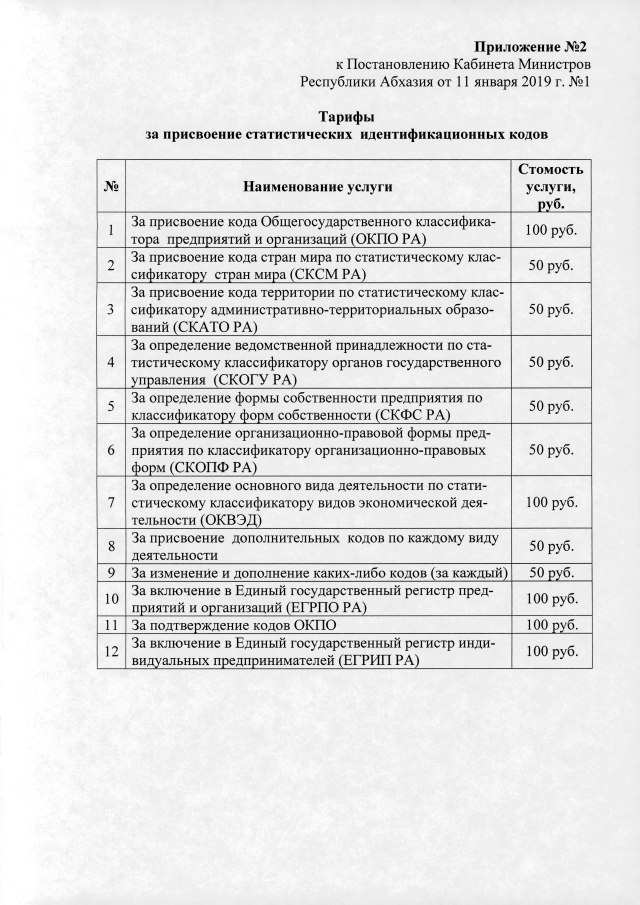 Постановление Кабинета Министров Республики Абхазия от 11.01.2019 № 1 "Об утверждении Порядка ведения Единого государственного регистра предприятий и организаций (ЕГРПО), Единого государственного регистра индивидуальных предпринимателей (ЕГРИП) и Тарифов за присвоение статистических идентификационных кодов"