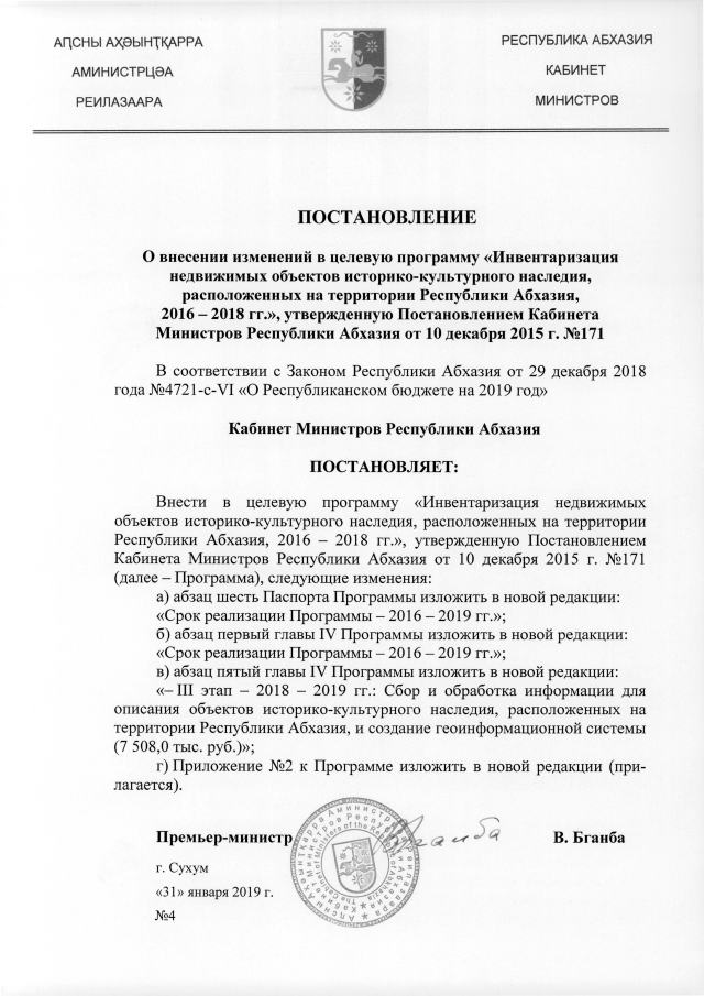 Постановление Кабинета Министров Республики Абхазия от 31.01.2019 № 4 "О внесении изменений в целевую программу <Инвентаризация недвижимых объектов историко-культурного наследия, расположенных на территории Республики Абхазия, 2016 - 2018 гг.>, утвержденную Постановлением Кабинета Министров Республики Абхазия от 10 декабря 2015 г. №171"