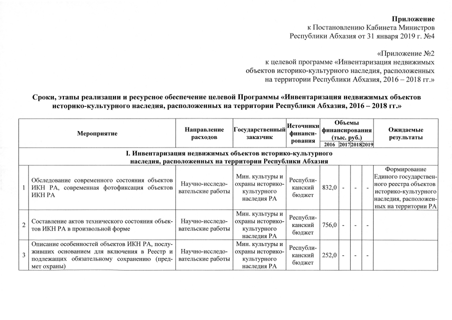 Постановление Кабинета Министров Республики Абхазия от 31.01.2019 № 4 "О внесении изменений в целевую программу <Инвентаризация недвижимых объектов историко-культурного наследия, расположенных на территории Республики Абхазия, 2016 - 2018 гг.>, утвержденную Постановлением Кабинета Министров Республики Абхазия от 10 декабря 2015 г. №171"