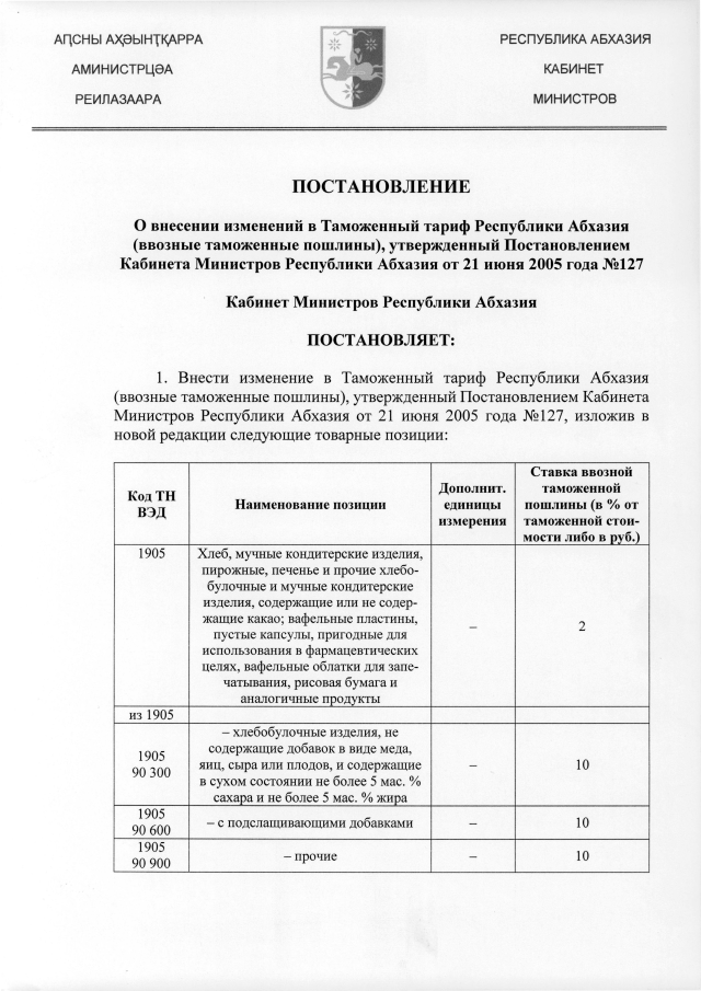 Постановление Кабинета Министров Республики Абхазия от 31.01.2019 № 5 "О внесении изменений в Таможенный тариф Республики Абхазия (ввозные таможенные пошлины), утвержденный Постановлением Кабинета Министров Республики Абхазия от 21 июня 2005 года №127"