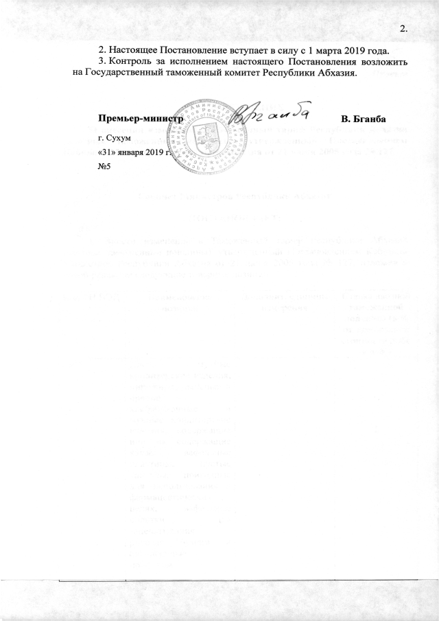 Постановление Кабинета Министров Республики Абхазия от 31.01.2019 № 5 "О внесении изменений в Таможенный тариф Республики Абхазия (ввозные таможенные пошлины), утвержденный Постановлением Кабинета Министров Республики Абхазия от 21 июня 2005 года №127"