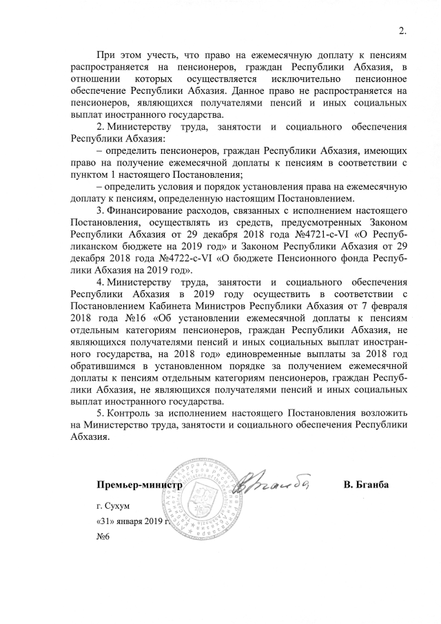 Постановление Кабинета Министров Республики Абхазия от 31.01.2019 № 6 "Об установлении ежемесячной доплаты к пенсиям отдельным категориям пенсионеров, граждан Республики Абхазия, не являющихся получателями пенсий и иных социальных выплат иностранного государства, на 2019 год"
