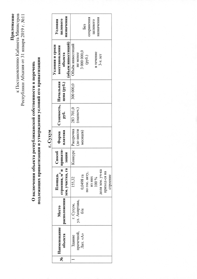 Постановление Кабинета Министров Республики Абхазия от 31.01.2019 № 11 " О включении части имущественного комплекса санатория <Гагрипш> (верхняя часть) в г. Гагра, пр. В. Ардзинба, 87 в перечень объектов, подлежащих приватизации, и утверждении условий его приватизации"