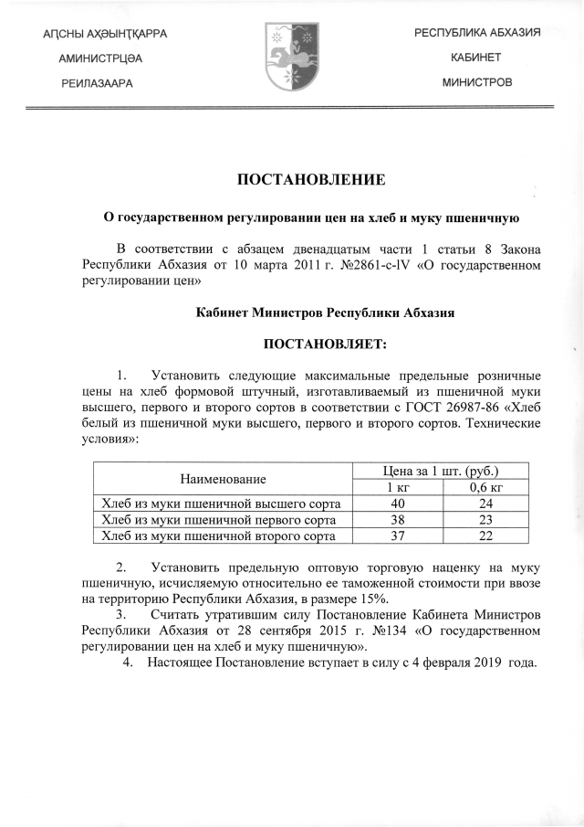 Постановление Кабинета Министров Республики Абхазия от 01.02.2019 № 15 "О государственном регулировании цен на хлеб и муку пшеничную"