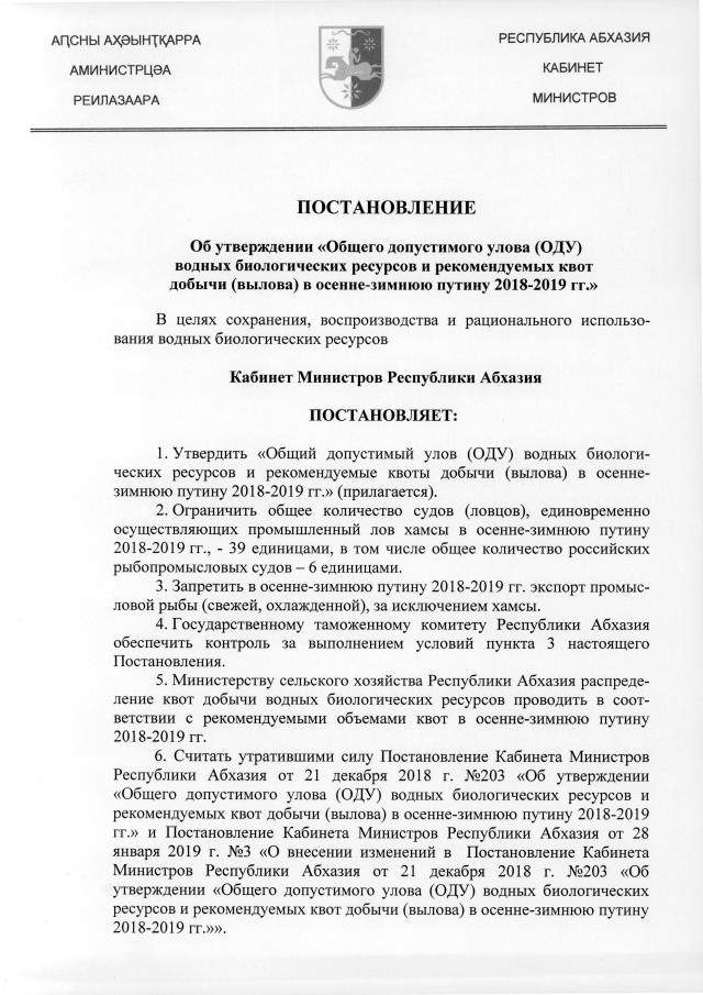 Постановление Кабинета Министров Республики Абхазия от 08.02.2019 № 16 "Об утверждении <Общего допустимого улова (ОДУ) водных биологических ресурсов и рекомендуемых квот добычи (вылова) в осенне-зимнюю путину 2018-2019 гг.>"