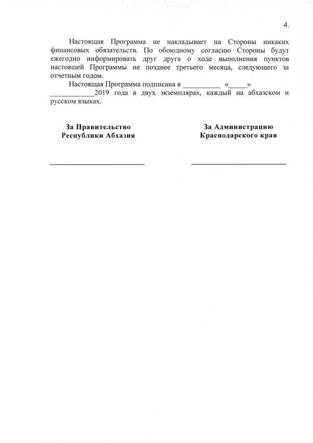 Постановление Кабинета Министров Республики Абхазия от 08.02.2019 № 18 "Об одобрении Программы мероприятий на 2019 - 2021 годы по реализации Соглашения между Правительством Республики Абхазия и Администрацией Краснодарского края (Российская Федерация) о торгово-экономическом, научно-техническом, гуманитарном и культурном сотрудничестве от 28.07.2009 г."