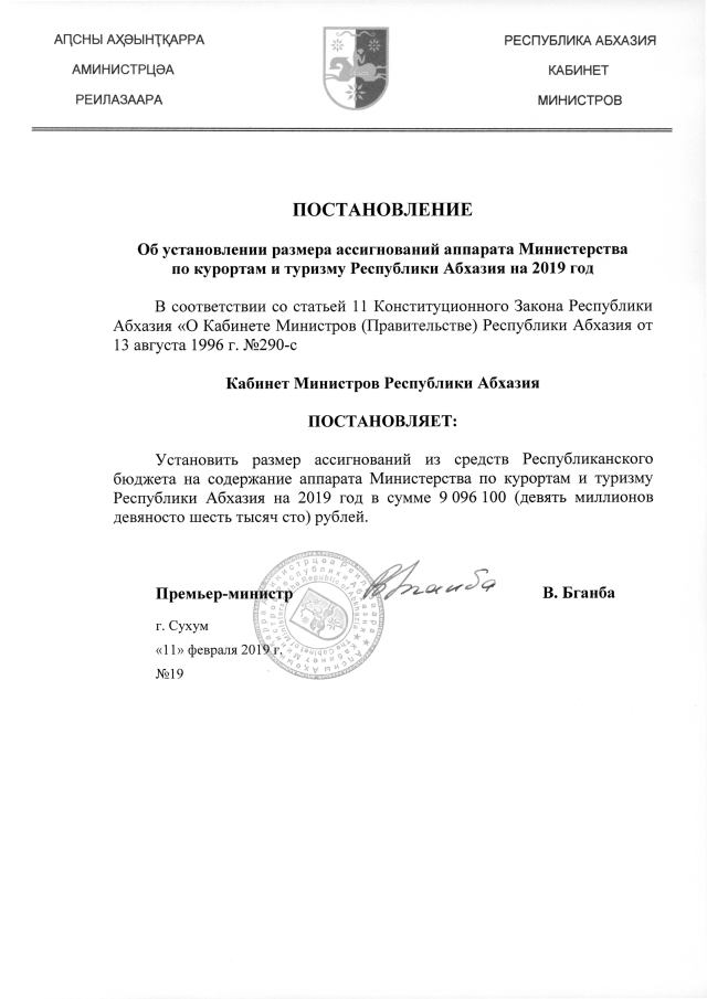 Постановление Кабинета Министров Республики Абхазия от 11.02.2019 № 19 "Об установлении размера ассигнований аппарата Министерства по курортам и туризму Республики Абхазия на 2019 год"