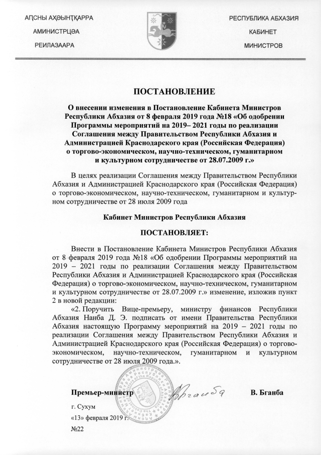 Постановление Кабинета Министров Республики Абхазия от 13.02.2019 № 22 "О внесении изменения в Постановление Кабинета Министров Республики Абхазия от 8 февраля 2019 года №18 <Об одобрении Программы мероприятий на 2019- 2021 годы по реализации Соглашения между Правительством Республики Абхазия и Администрацией Краснодарского края (Российская Федерация) о торгово-экономическом, научно-техническом, гуманитарном и культурном сотрудничестве от 28.07.2009 г.>"