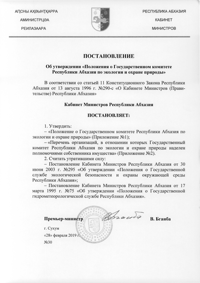 Постановление Кабинета Министров Республики Абхазия от 28.02.2019 №30 "Об утверждении <Положения о Государственном комитете Республики Абхазия по экологии и охране природы>"