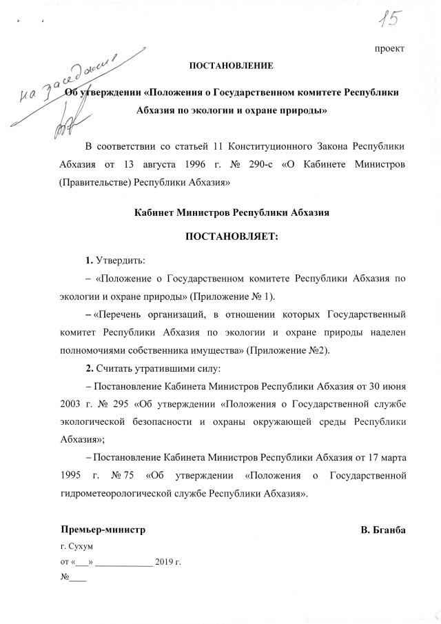 Постановление Кабинета Министров Республики Абхазия от 28.02.2019 №30 "Об утверждении <Положения о Государственном комитете Республики Абхазия по экологии и охране природы>"