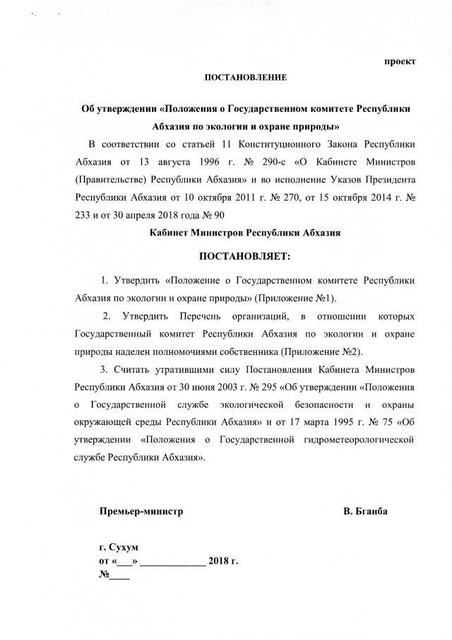 Постановление Кабинета Министров Республики Абхазия от 28.02.2019 №30 "Об утверждении <Положения о Государственном комитете Республики Абхазия по экологии и охране природы>"