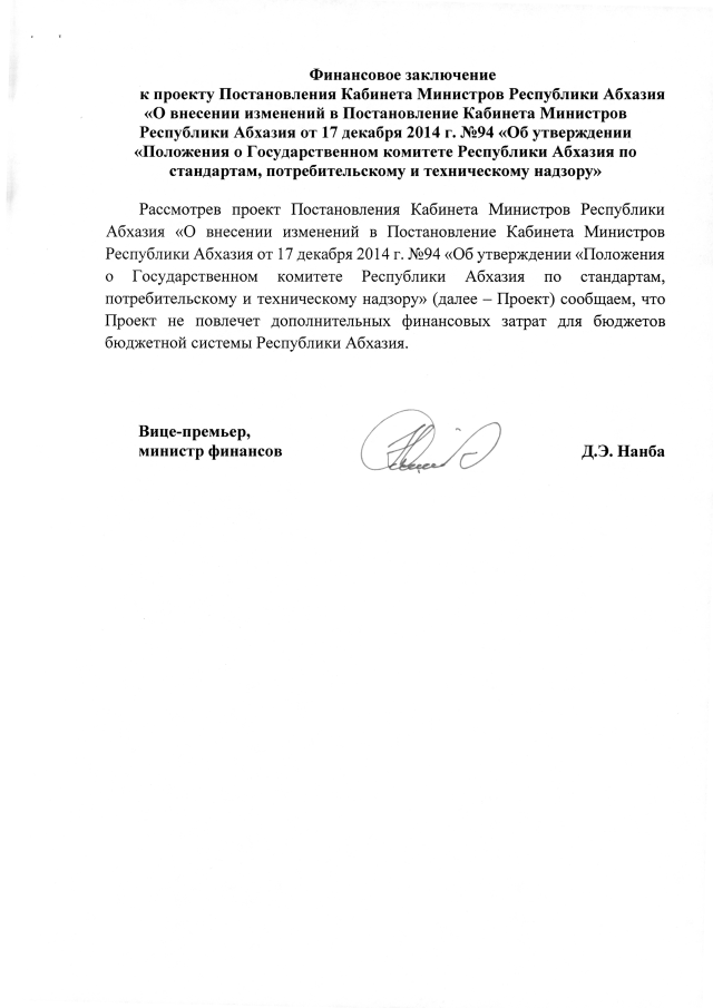 Постановление Кабинета Министров Республики Абхазия от 28.02.2019 №29 "О внесении изменений в Постановление Кабинета Министров Республики Абхазия от 17 декабря 2014 г. №94 <Об утверждении <Положения о Государственном комитете Республики Абхазия по стандартам, потребительскому и техническому надзору>"