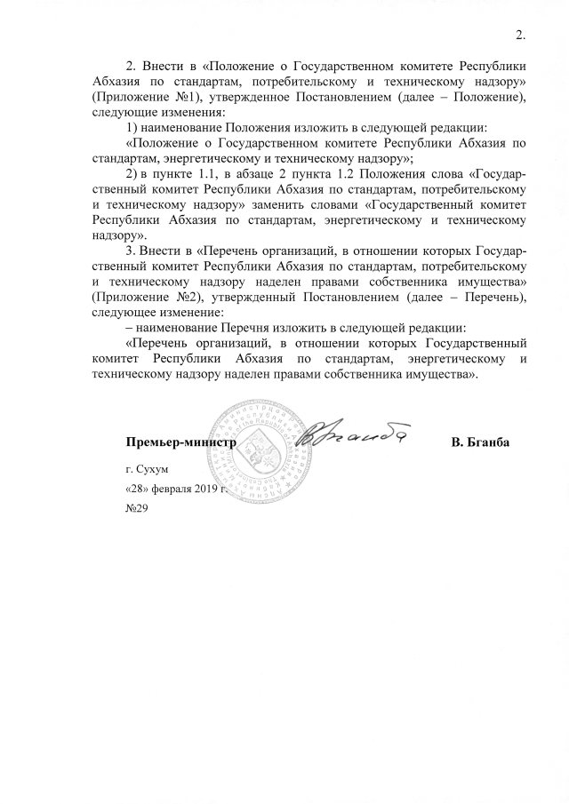 Постановление Кабинета Министров Республики Абхазия от 28.02.2019 №29 "О внесении изменений в Постановление Кабинета Министров Республики Абхазия от 17 декабря 2014 г. №94 <Об утверждении <Положения о Государственном комитете Республики Абхазия по стандартам, потребительскому и техническому надзору>"
