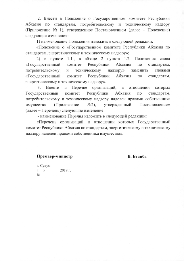 Постановление Кабинета Министров Республики Абхазия от 28.02.2019 №29 "О внесении изменений в Постановление Кабинета Министров Республики Абхазия от 17 декабря 2014 г. №94 <Об утверждении <Положения о Государственном комитете Республики Абхазия по стандартам, потребительскому и техническому надзору>"