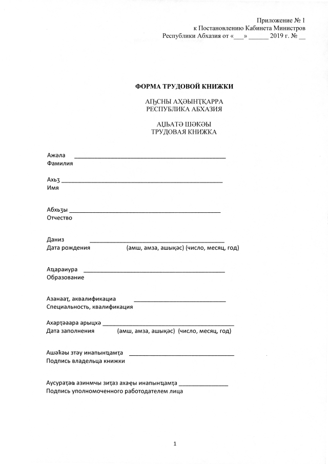 Постановление Кабинета Министров Республики Абхазия от 02.02.2019 №26 "Об утверждении Формы, Порядка ведения и хранения трудовых книжек"