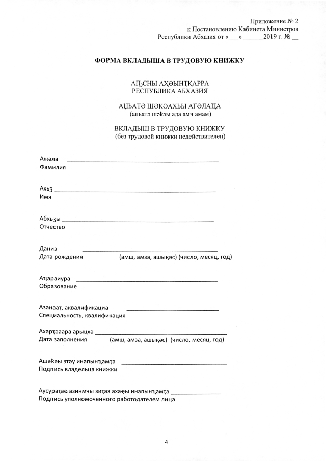 Постановление Кабинета Министров Республики Абхазия от 02.02.2019 №26 "Об утверждении Формы, Порядка ведения и хранения трудовых книжек"