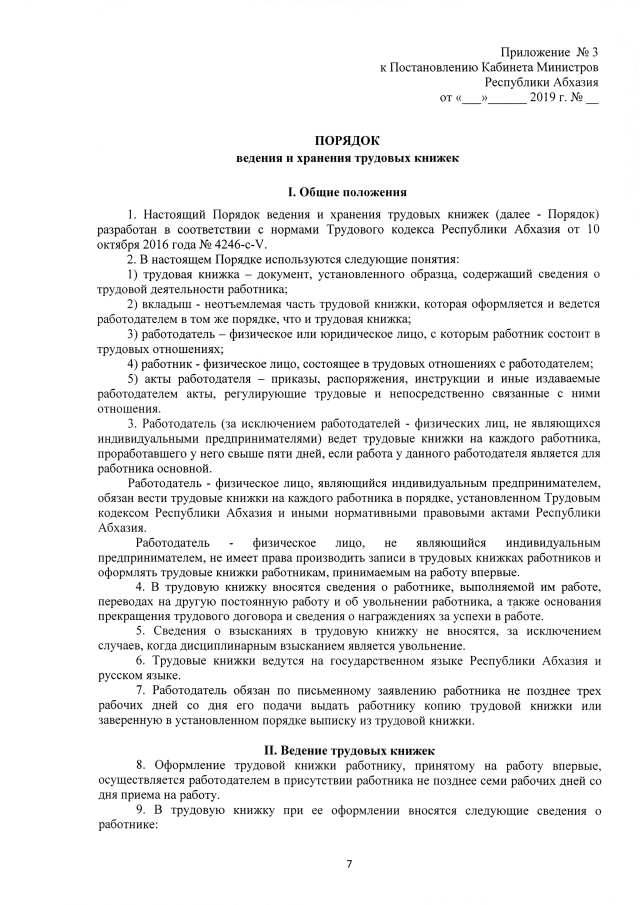Постановление Кабинета Министров Республики Абхазия от 02.02.2019 №26 "Об утверждении Формы, Порядка ведения и хранения трудовых книжек"