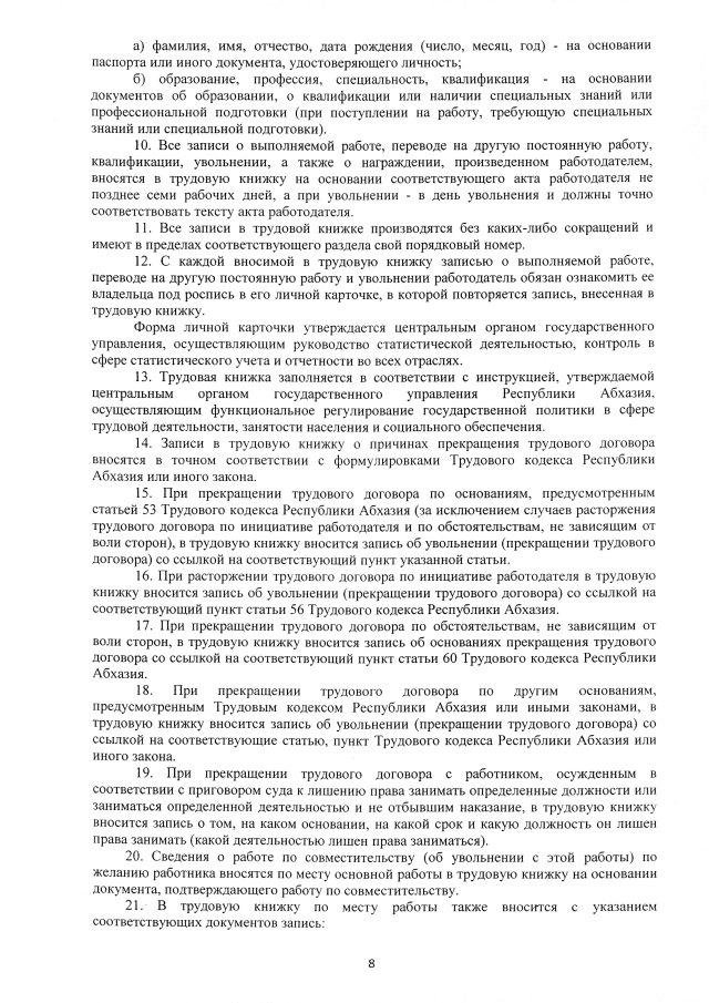 Постановление Кабинета Министров Республики Абхазия от 02.02.2019 №26 "Об утверждении Формы, Порядка ведения и хранения трудовых книжек"