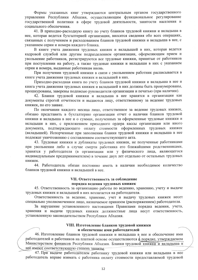 Постановление Кабинета Министров Республики Абхазия от 02.02.2019 №26 "Об утверждении Формы, Порядка ведения и хранения трудовых книжек"
