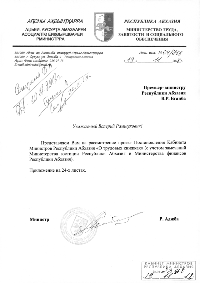 Постановление Кабинета Министров Республики Абхазия от 02.02.2019 №26 "Об утверждении Формы, Порядка ведения и хранения трудовых книжек"
