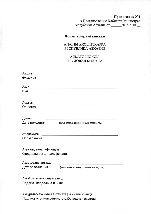 Постановление Кабинета Министров Республики Абхазия от 02.02.2019 №26 "Об утверждении Формы, Порядка ведения и хранения трудовых книжек"