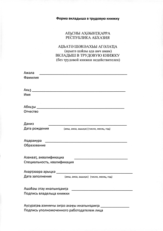 Постановление Кабинета Министров Республики Абхазия от 02.02.2019 №26 "Об утверждении Формы, Порядка ведения и хранения трудовых книжек"