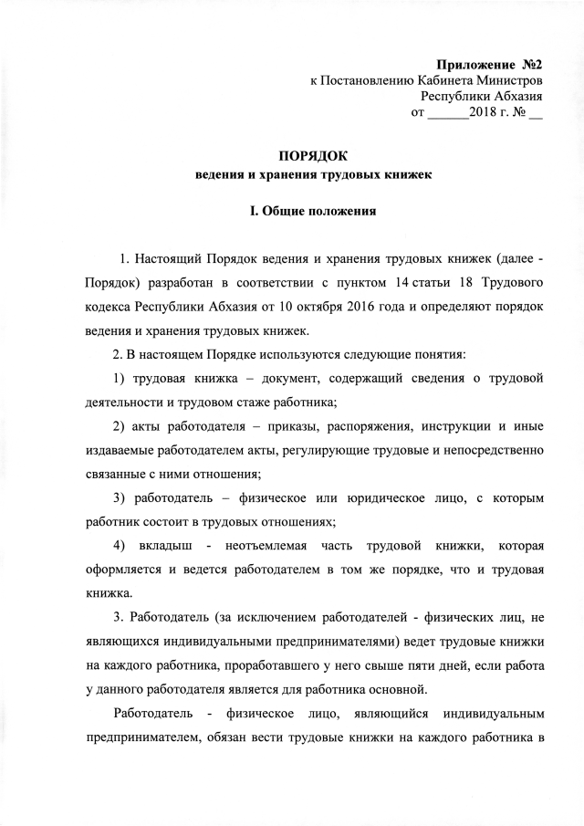 Постановление Кабинета Министров Республики Абхазия от 02.02.2019 №26 "Об утверждении Формы, Порядка ведения и хранения трудовых книжек"