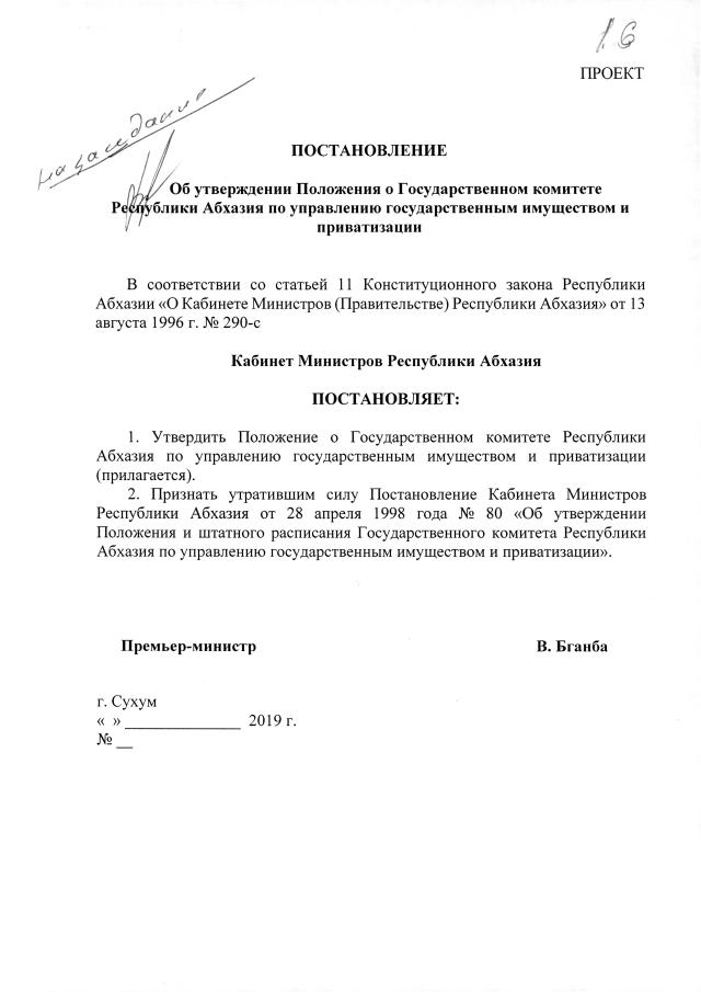 Постановление Кабинета Министров Республики Абхазия от 28.02.2019 №31 "Об утверждении Положения о Государственном комитете Республики Абхазия по управлению государственным имуществом и приватизации"