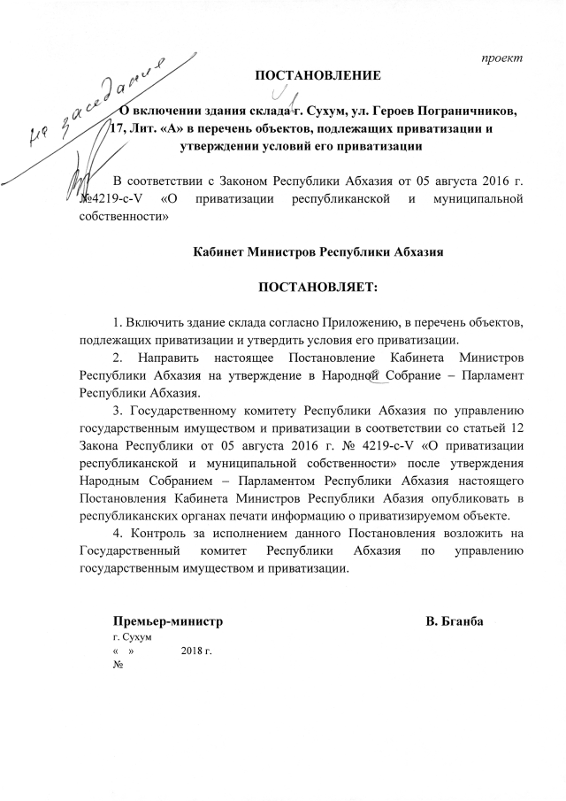 Постановление Кабинета Министров Республики Абхазия от 28.02.2019 №32 "О включении здания склада в г. Сухум, ул. Героев Пограничников, 17, Лит. <А> в перечень объектов, подлежащих приватизации, и утверждении условий его приватизации"