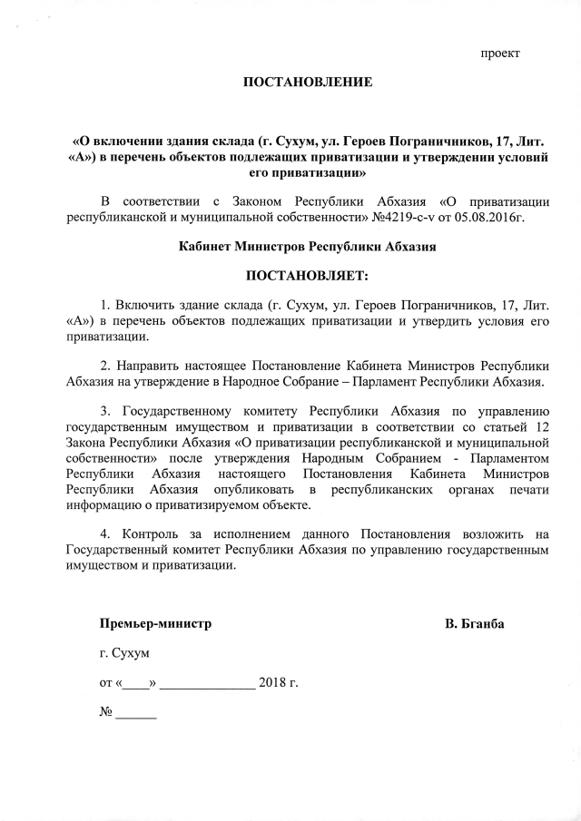 Постановление Кабинета Министров Республики Абхазия от 28.02.2019 №32 "О включении здания склада в г. Сухум, ул. Героев Пограничников, 17, Лит. <А> в перечень объектов, подлежащих приватизации, и утверждении условий его приватизации"