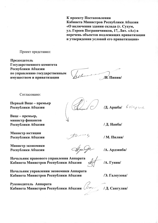 Постановление Кабинета Министров Республики Абхазия от 28.02.2019 №32 "О включении здания склада в г. Сухум, ул. Героев Пограничников, 17, Лит. <А> в перечень объектов, подлежащих приватизации, и утверждении условий его приватизации"