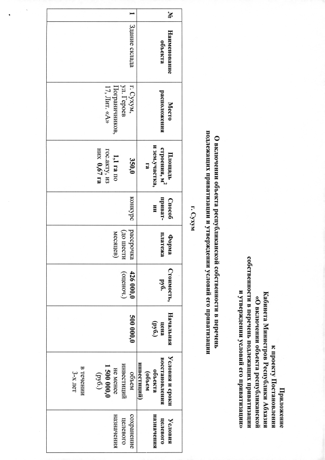 Постановление Кабинета Министров Республики Абхазия от 28.02.2019 №32 "О включении здания склада в г. Сухум, ул. Героев Пограничников, 17, Лит. <А> в перечень объектов, подлежащих приватизации, и утверждении условий его приватизации"