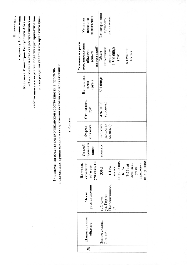 Постановление Кабинета Министров Республики Абхазия от 28.02.2019 №32 "О включении здания склада в г. Сухум, ул. Героев Пограничников, 17, Лит. <А> в перечень объектов, подлежащих приватизации, и утверждении условий его приватизации"