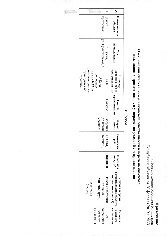 Постановление Кабинета Министров Республики Абхазия от 28.02.2019 №33 "О включении здания проходной в г. Сухум, ул. Гумистинская, 4 в перечень объектов, подлежащих приватизации, и утверждении условий его приватизации"